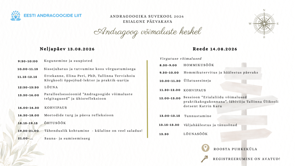 Andragoogika ei vii ühte kindlasse ametisse ega ühte kindlasse sihtkohta. Sagedamini seisame hoopis ristmikul – erinevate rollide, keskkondade ja võimaluste keskel – ning teeme valikuid, kuhu ja kuidas edasi liikuda. Sellest mõttest tulenevalt kannab selle aasta suvekool pealkirja “Andragoog võimaluste keskel”.